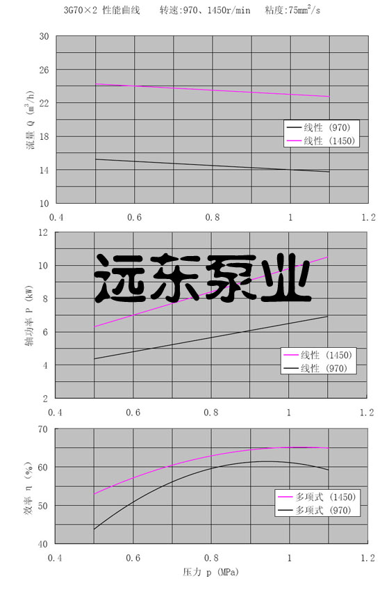3GR70*2三螺桿泵轉(zhuǎn)速960,1450r/min,粘度75cst性能曲線圖